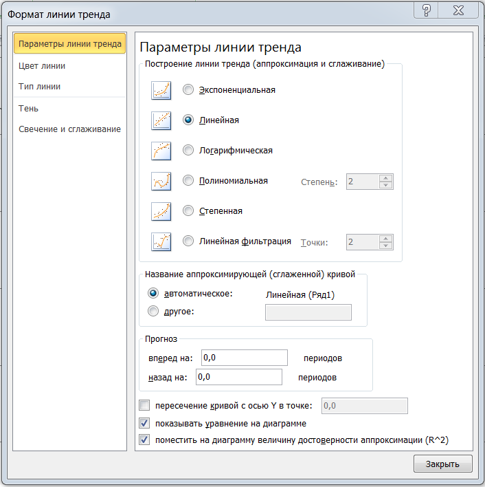 Рис. 2.8. Задание параметров линии тренда