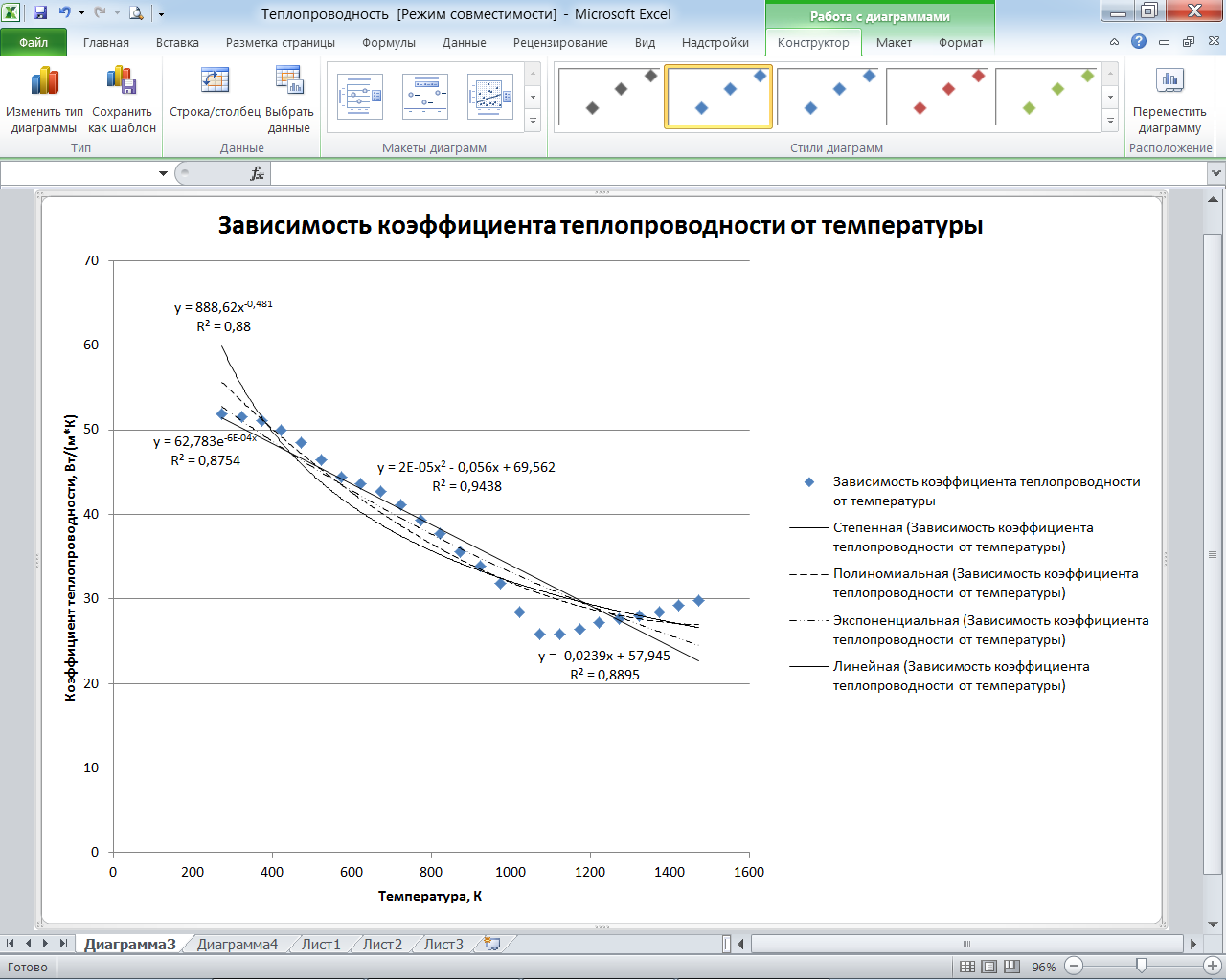 На основе полученной диаграммы можно получить описание зависимости коэффициента теплопроводности от температуры в виде уравнения. Поскольку график имеет криволинейную зависимость, то наиболее точное описание дадут степенные функции.