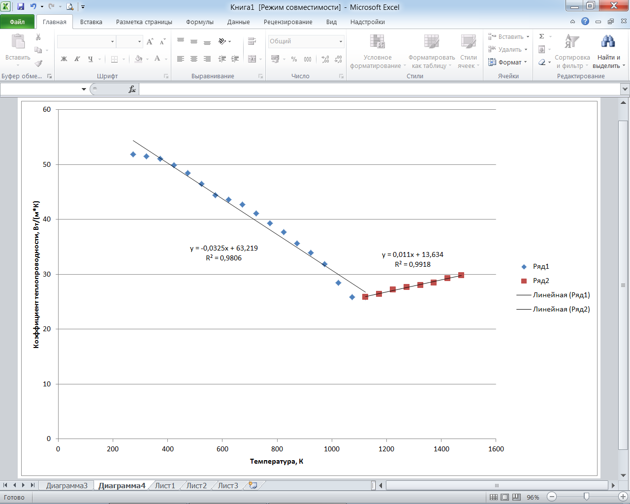 Строим новую точечную диаграмму. Снова выбираем Вставка >Диаграммы > Точечнаясмаркерами. Выделяем область для построения диаграммы, выбираем Работа с диаграммами > Конструктор > Выбрать данные > Выбор источника данных > Добавить. В окне Изменение Ряда в строке Имя ряда ячейку можно оставить пустой, тогда ей автоматически будет присвоено имя Ряд 1), для заполнения строки Значения Х выделяем температуры от 273 К до 1123 К, для заполнения строки Значения Y выделяем значения коэффициента теплопроводности, соответствующие данному температурному диапазону. Нажимаем ОК. Снова в окне Выбор источника данных выбираем Добавить. Теперь для заполнения строки Значения Х выделяем температуры от 1123 К до 1473 К, для заполнения строки Значения Y выделяем соответствующие значения коэффициента теплопроводности. Нажимаем ОК. Далее подписываем оси и перемещаем диаграмму на отдельный лист как было описано выше. Итогом станет диаграмма, состоящая из двух графиков (рис. 2.10).