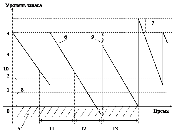 1 – страховой запас; 2 – подготовительный запас; 3 – средний запас; 4 – максимальный запас; 5 – дефицит; 6 – текущий запас; 7 – сверхнормативная поставка; 8 – минимальный запас (страховой + подготовительный); 9 – недопоставка; 10 – точка заказа ROP (Reorder point); 11 – период между заказами; 12 – время выполнения поставки; 13 – период между поставками