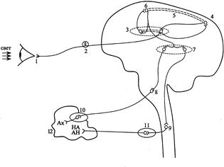 1) фоторецепторы глаза, 2) афферентный нейрон, 3) таламус, 4) корковый центр зрительного анализатора, 5) временные связи, 6) корковый центр слюноотделения, 7) гипоталамус, 8) бульбарный парасимпатический центр слюноотделения, 9) спинальный симпатический центр слюноотделения, 10) парасимпатический ганглий, 11) симпатический ганглий, 12) слюнная железа.