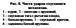 Ударно-спусковой механизм состоит из спускового крючка, спусковой тяги с рычагом взвода, шептала с пружиной, курка, боевой пружины и задвижки боевой пружины.