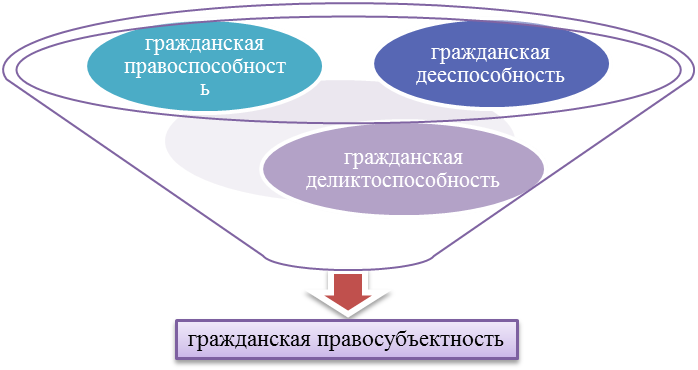 Гражданская правосубъектность – это право общего типа, установленное и гарантированное государством и предоставляющее лицу возможность быть участником гражданских правоотношений. Составляющими гражданской правосубъектности любой категории лиц (граждан, юридических лиц) являются гражданская правоспособность и гражданская дееспособность (рис. 6.2.).
