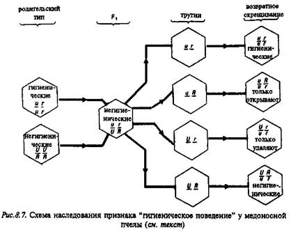 Генетический анализ – оценка поведения гибридов, полученных от скрещивания устойчивых к болезни и подверженных заболеванию пчел, показал, что это "гигиеническое поведение" детерминировано двумя независимыми генами, причем аллели, определяющие устойчивость к заболеванию, рецессивны (рис. 8.7).