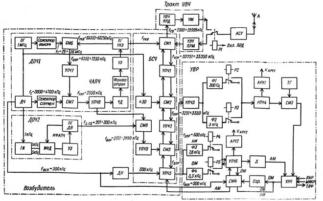 Возбудитель радиостанции представляет собой устройство диапазонно-кварцевой стабилизации частоты — синтезатор частот комбинированного типа.