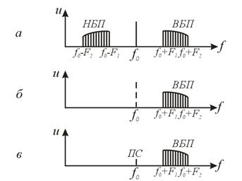 не несет информации о передаваемом сообщении, а выполняет лишь вспомогательную роль, то ее можно исключить из состава излучаемых сигналов. Полезная информация содержится только в боковых частотах. Если исключить из состава излучаемых сигналов колебания несущей частоты и одной из боковых частот, связь можно осуществить и на одной боковой частоте.