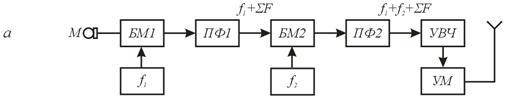 Из рис.2,б видно, что процесс формирования ОМ сигнала можно представить как процесс перемещения спектра, модулирующего сигнала в области более высоких частот с сохранением неизменными интервала между составляющими спектра и соотношением между их амплитудами. После усиления в УВЧ ОМ сигнал подается на усилитель мощности (УМ), а затем в антенну.