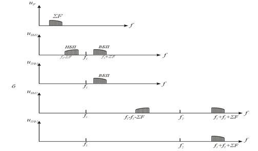 а - с амплитудной модуляцией; б - с ОМ на верхней боковой полосе;