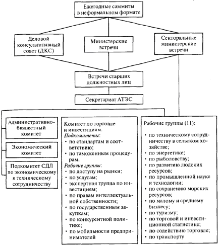Главные рабочие органы АТЭС: Деловой консультационный совет, три комитета экспертов (комитет по торговле и инвестициям, экономический комитет, административно-бюджетный комитет) и 11 рабочих групп по различным отраслям экономики.