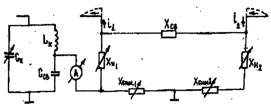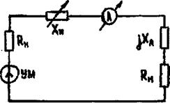 Здесь в состав САУ введены элементы настройки Хн и амперметр. Элемент настройки Хн это переменное реактивное сопротивление. При Ха < 0, когда 0 < l/l < ¼, сопротивление Хн должно иметь индуктивный характер («Удлиняющая» катушка); при Ха > 0, когда ¼ < l/l < ½ сопротивление Хн должно иметь ёмкостный характер («Укорачивающий» конденсатор). Амперметр вводится в схему САУ для определения момента настройки САУ по максимуму точка в антенной цепи.