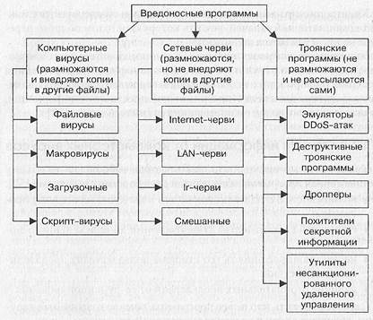 Троянские программы подразделяют на несколько видов (рисунок 1), которые маскируются под полезные программы и выполняют деструктивные функции. Они могут обеспечить злоумышленнику скрытый несанкционированный доступ к информации на компьютере пользователя и ее похищение (отсюда их название). Такие программы иногда называют утилитами несанкционированного удаленного управления.