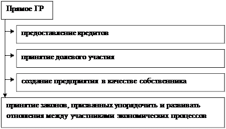 Различают два типа государственного регулирования – прямое и косвенное регулирование. Прямое ГР – это расширение государственной собственности на материальные ресурсы, законотворчество, управление предприятиями (рис.I.2.4):