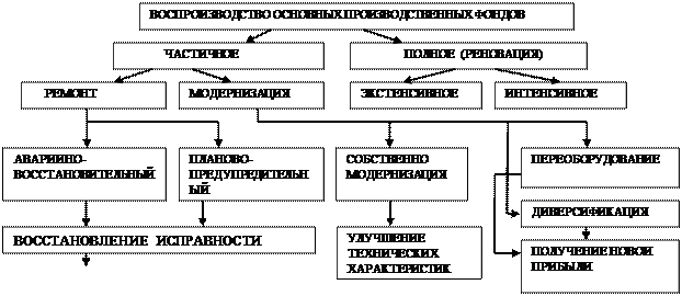 При полном износе действующие фонды ликвидируются и заменяются новыми (капитальное строительство или текущая замена изношенных ОФ). Частичный износ возмещается путем ремонта.