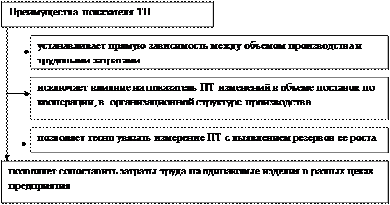 Трудоемкость продукции (ТП) выражает затраты рабочего времени на производство единицы продукции. Определяется на единицу продукции в натуральном выражении по всей номенклатуре изделий и услуг; при большом ассортименте продукции на предприятии определяется по типичным изделиям, к которым приводятся все остальные. В отличие от показателя выработки этот показатель имеет ряд преимуществ (рис. I.6.2):