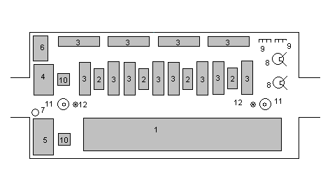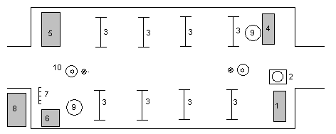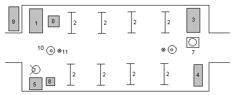 | Сортировочная для тяжелопострадавших. 1-стол регистратора,2-подсавки под носилки, 3-хозяйственный стол, 4-аппарат для ИВЛ портативный (или КИ-4), 5-комплекти Б-1 и В-2, 6-умывальник, 7-блок с питьевой водой, 8-табурет,9-навес для обменного фонда носилок, 10-печь, 11-стойка средняя. |