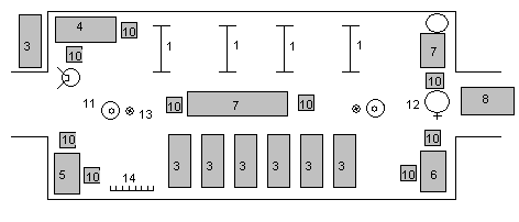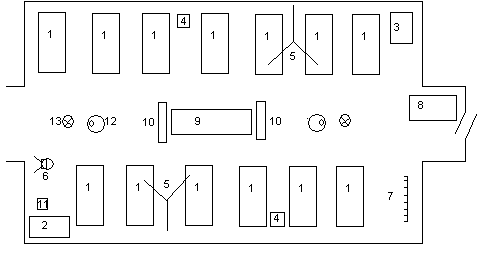 | Сортировочная для легкопострадавших. 1-станок трехъярусный СП-6, 2-СП-3, 3-скамья, 4-стол медсестры, 5-стол регистратора, 6-стол для лекарственных средств, 7-стол хозяйственный, 8-комплекты Б-1, 9-умывальник, 10-табурет, 11-печь, 12-бачок с питьевой водой, 13-стойка средняя, 14- вешалка. |