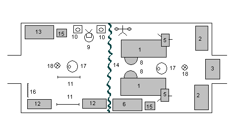 | Перевязочная для легкопострадавших в палатке УСБ-56. 1-стол перевязочный, 2-стол для стерильных лекарственных средств, 3-стол для стерильных инструментов, 4-стол для стерильных перевязочных средств, 5-столик инструментальный, 6-стол регистратора, 7-тазы для мытья рук хирургов, 8-таз для использованных перевязочных средств и инструментов, 9-умывальник, 10-табурет с ёмкостью для счеток, 11-подставки под носилки низкие, 12-скамья, 13-стол для лекарственных средств и предметов ухода за пострадавшими,14-занавесь разгораживающая, 15-табурет, 16-вешалка, 17-печь, 18-стойка палатки. |