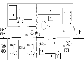 | Изолятор (инфекционный). А-смотровая, Б-бокс для больных с воздушно-капельной инфекцией, В-бокс для больных с ОКИ, Г-пост медсестры 1-кровать полевая, 2-табурет, 3-стол для работы врача и медсестры, 4-ящики -укладки с лекарствами и оборудованием, 5-разграничивающая занавесь, 6-умывальник с тазом, 7-вешалка, 8-скамья, 9-кронштейн, 10-печь, 11-ингалятор кислородный, 12-электроотсос, 13-стойка универсальная с флаконодержателем, 14-бачок с питьевой водой, 15-коврик с дезинф. раствором, 16-судно, 17-мочеприемник, 18-емкость для дезинф. средств, 19-емкость для обеззараживания посуды, 20-емкость для суден, 21-емкость для обеззараживание остатков пищи. |