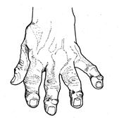 С-м «плавника моржа» - отклонение пальцев кисти в сторону локтевой кости в результате подвывихов в пястно- фаланговых суставах.