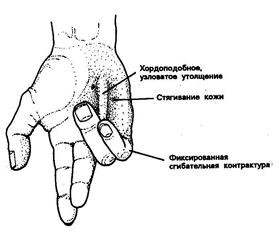 сухожилиями разгибателей кистей. Сморщивание кожи с утолщением ладонной