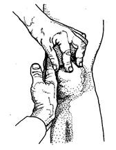 Глубокая пальпация позволяет определять болезненность по ходу суставной щели, например коленного сустава. Пальпацию сустава проводят с медиальной и латеральной сторон коленного сустава..
