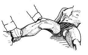 Оценка стабильности коллатеральных связок коленного сустава производится в состоянии легкого сгибания. Одной рукой толкают бедро медиально, а другой голень латерально (рис.13). При этом – избыточное движение голени в сторону (латерально), указывает на поражение медиальной связки. Латеральная связка исследуется подобным образом. В норме боковые движения в суставе невозможны.