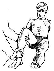 При поражении периартикулярных тканей болезненность выявляют при резистивных активных движениях (рис.10). Исследование проводится следующим образом. Врач пытается произвести движение в суставе, а пациент при этом оказывает активное сопротивление этому движению, напрягая соответствующие мышцы. Если при резистивных активных движениях в суставе появляется боль, а движения в это время в суставе отсутствуют, речь идет о поражении мышц, сухожилий и других периартикулярных тканей, а не самого сустава.