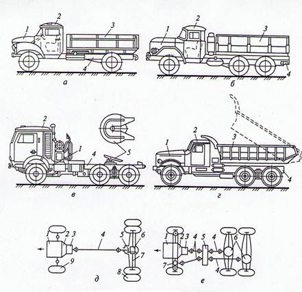 Рисунок 2.1 – Грузовые автомобили: а – с открытой платформой и бортами; б – повышенной проходимости; в – тягач с седельным устройством; г – самосвал; д – кинематическая схема грузового автомобиля с колесной формулой 4 х 2; е – кинематическая схема грузового автомобиля с колесной формулой 6 х 6 /1/