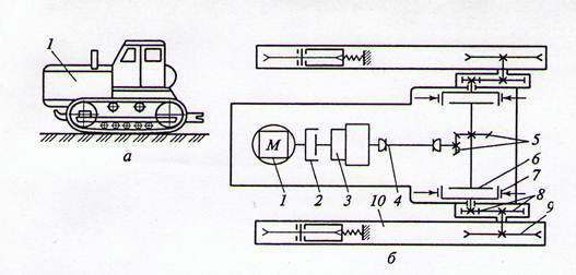 Рисунок 2.2 – Общий вид (а) и кинематическая схема гусеничного трактора с механической трансмиссией (б) /1/