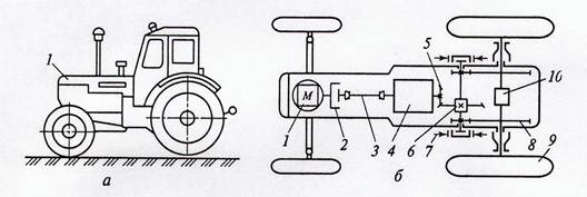 Рисунок 2.3 – Общий вид (а) и кинематическая схема (б) колесного трактора /1/
