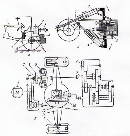 Рисунок 2.4 – Общий вид (а), кинематическая схема (б) и поворотный механизм (в) одноосного тягача /1/