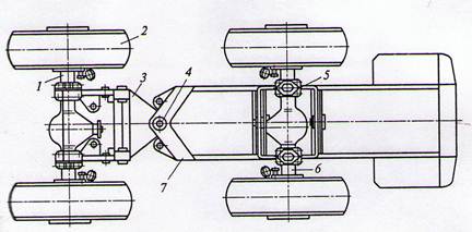 В таких машинах обе полурамы (передняя – 3 и задняя – 7), с подвешенными унифицированными ведущими неповоротными мостами – 1 и – 6 с колесами – 2, соединены вертикальным шарниром – 4, обеспечивающим взаимный поворот рам в горизонтальной плоскости на угол до 40о.