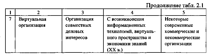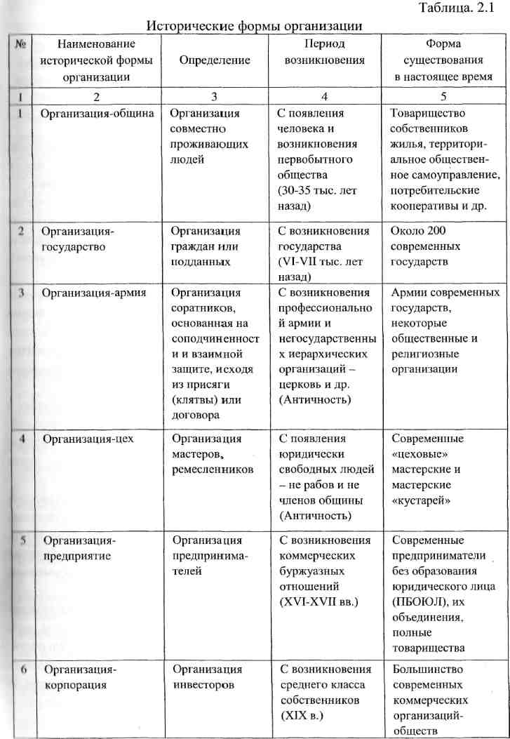 За весь период существования, начиная с возникновения первобытного общества, организации пережили несколько наиболее традиционных организационных форм. Возникли данные формы на различных этапах развития человечества, при этом все формы, представленные в различных проявлениях человеческой деятельности, существуют и поныне (табл. 2.1).