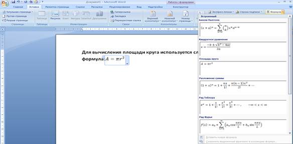 вкладка Вставка - Группа Инструментов Символы – кнопка Формула – вызывается соответствующая Панель со списком Встроенных формул, т.е. наиболее распространенных готовых формул (См. рис. 29).