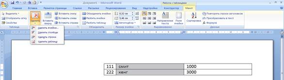 вкладкаРабота с таблицами – Макет - Группа Инструментов Столбцы и строки – кнопка Удалить – соответствующее меню(См. рис. 10).