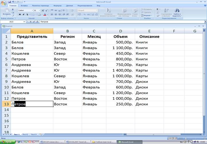 4. Ввести новые записи (то есть данные) под Заголовками. (См. Рис.1)При этом следует соблюдать единый стиль заполнения, чтобы позднее взаимосвязанные записи могли быть выделены в группы. Количество строк может быть любым; в списке не должно быть пустых строк (даже между заголовками столбцов и первой записью). Каждый столбец представляет собой Поле, содержащее однородную информацию. Каждая строка соответствует Записи данных
