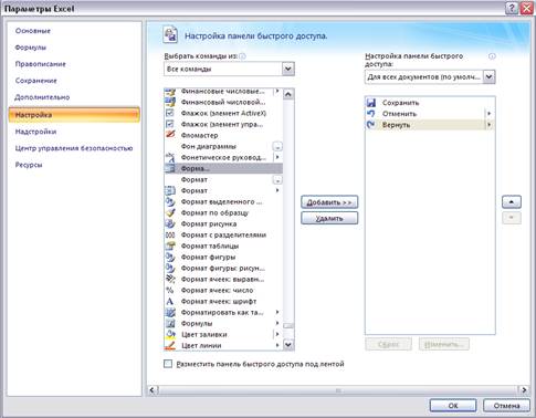 Кнопка Office – кнопка Параметры Excel – соответствующее диалоговое окно – категория Настройка – раскрывающийся список Выбрать команды из - опция Все команды – выбор кнопкиФорма,затемкнопка Добавить.