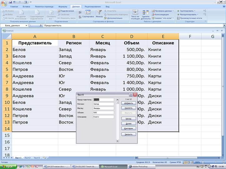 Для облегчения обработки данных в списках в Excel имеется инструмент Форма, предназначенный для добавления, удаления и поиска записей.
