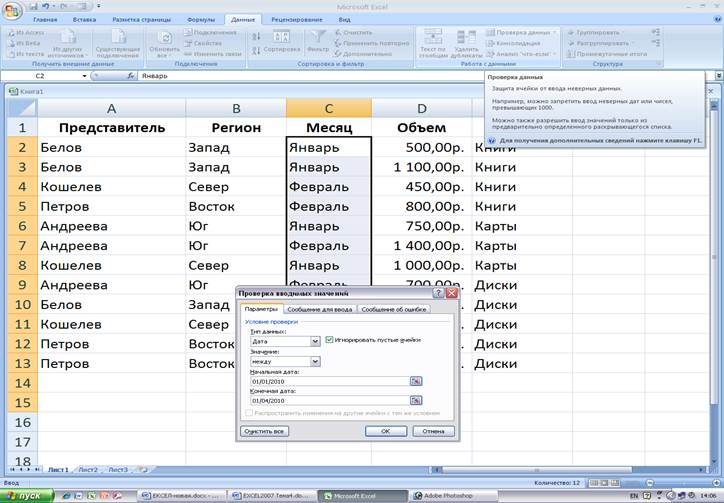 Если с Листом работают сразу несколько пользователей, желательно контролировать тип вводимой ими информации и свести к минимуму ошибки ввода. Например, можно потребовать, чтобы в столбец Месяц можно было ввести только январские и февральские даты или чтобы сумма в столбце Объем входила в определенный диапазон. В Excel выполнение подобных условий проверяется при помощи инструмента Проверка вода. С его помощью возможно частично или полностью защитить Лист от ошибок ввода, которые приводят к неправильному вычислению формул или к нарушению работы средств обработки списков.