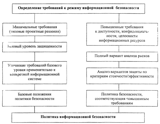 1. Определение необходимых руководящих документов и стандартов в области ИБ, а также основных положений политики ИБ, включая: - управление доступом к средствам вычислительной техники (СВТ), программам и данным; - антивирусную защиту; - вопросы резервного копирования; - проведение ремонтных и восстановительных работ; - информирование об инцидентах в области ИБ. 2. Определение подходов к управлению рисками: является ли достаточным базовый уровень защищенности или нужно проводить полный вариант анализа рисков. 3. Структуризация контрмер по уровням. 4. Порядок сертификации на соответствие стандартам в области ИБ: график совещаний по тематике ИБ на уровне руководства, периодичность пересмотра положений политики ИБ, а также порядок обучения всех категорий пользователей информационной системы в этой области. Минимальным требованиям к информационной безопасности соответствует базовый уровень ИБ, обычно реализуемый в типовых проектных решениях. В стандарте определен набор наиболее вероятных угроз, таких, как вирусы, сбои оборудования, несанкционированный доступ и т.д. Контрмеры для нейтрализации этих угроз должны быть приняты обязательно вне зависимости от вероятности их осуществления и уязвимости ресурсов. Таким образом, характеристики угроз на базовом уровне рассматривать не обязательно. В случаях, когда нарушения режима ИБ чреваты тяжелыми последствиями, базового уровня требований к безопасности информации становится недостаточно. Чтобы сформулировать дополнительные требования, необходимо: - определить ценность ресурсов; - к стандартному набору добавить список угроз, актуальных для исследуемой информационной системы; - оценить вероятность угроз; - определить уязвимость ресурсов. Должна быть разработана стратегия управления рисками разных классов. На практике, после принятия стандартного набора контрмер, ряд рисков уменьшается, но все же остается значимым. Поэтому необходимо знать остаточную величину риска. Когда этап по определению принимаемых во внимание рисков завершен, должна быть предложена стратегия управления ими. Комплекс предлагаемых мер должен быть построен в соответствии с выбранной стратегией управления рисками и структурирован по уровням (организационному, программно-техническому) и отдельным аспектам безопасности. Если проводится полный вариант анализа рисков, то эффективность комплекса контрмер оценивается для каждого риска. Если к ИБ предъявляются повышенные требования, про-водится так называемый полный вариант анализа рисков, в рамках которого в дополнение к базовым рассматриваются: - модель бизнес-процессов с точки зрения ИБ; - ресурсы организации и их ценность; - составление полного списка угроз безопасности - потен-циальные источники нежелательных событий, которые могут нанести ущерб ресурсам, и оценка их параметров; - уязвимости - слабые места в защите, которые могут спро-воцировать реализацию угрозы. На основе собранных сведений оцениваются риски для ин-формационной системы организации, для отдельных ее подсистем, баз данных и элементов данных. Следующим шагом является выбор контрмер, снижающих риски до приемлемых и формируется структура системы защиты информации.