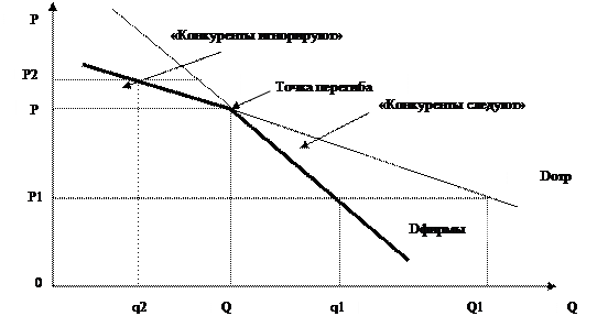 Допустим, схожие фирмы продают идентичный товар по цене Р, реализуя Q единиц продукции. Если бы одна фирма снизила цену до Р1, то она могла бы увеличить объем продаж до Q1. Но, так как другие фирмы отрасли последуют ее примеру, то она сможет реализовать только q1. Если же фирма повысит цену (Р2), то при отсутствии реакции со стороны других фирм она реализует q2.