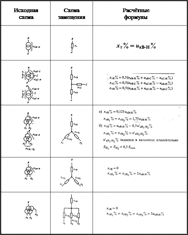 Одним из основных элементов системы является силовой трансформатор. По конструкции он может быть: двухобмоточный, трёхобмоточный, автотрансформатор и трансформатор с расщеплёнными обмотками со стороны низшего напряжения (две, три и более). Ниже показаны их мнемоническое изображение, схема замещения и расчётные формулы (табл. 6.2).