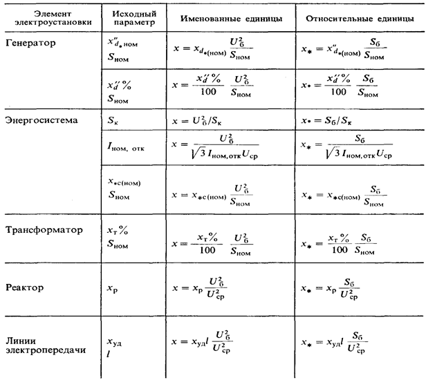 Для генераторов, трансформаторов, токоограничивающих реакторов, двигателей, обобщенной нагрузки сопротивления задаются в относительных единицах. Как известно, под относительным значением какой либо величины понимают ее отношение к другой одноименной физической величине, выбранной за единицу измерения. В данном случае относительные сопротивления указанных элементов задаются при номинальных условиях.