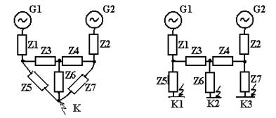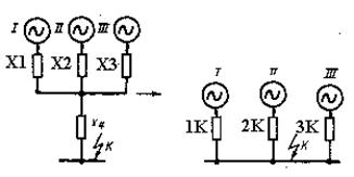 2. Когда КЗ находится в узле с несколькими сходящимися в нем ветвями, этот узел можно разрезать, сохранив на конце каждой образовавшейся ветви такое же КЗ. Далее полученную схему нетрудно преобразовать относительно любой из точек КЗ, учитывая другие ветви с КЗ как нагрузочные ветви с ЭДС равными нулю (рис.6.4).