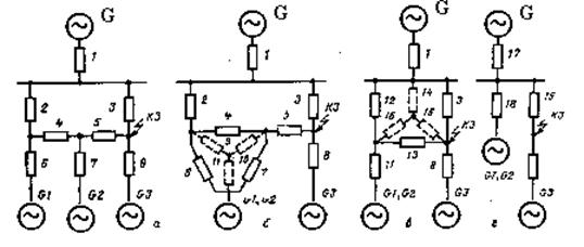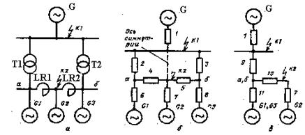 Если точка КЗ делит схему на две симметричные части, например точки К1, К2, то при одинаковых характеристиках генераторов G1, G3 и трансформаторов узлы а и b схемы будут иметь одинаковые потенциалы, вследствие чего их можно совместить: ветви генераторов G1 и G3 объединяют, представляя их эквивалентной машиной с S = 2Sном. В результате получится схема ”в”. В этой схеме