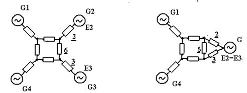 Если схема имеет одинаковые ЭДС, то в некоторых случаях упрощение схемы достигается объединением источников. Например, если схема на рис.6.7,а имеет одинаковые ЭДС Е2 и Е3, то объединяя эти ЭДС и преобразуя полученный треугольник 2-3-6 в эквивалентную звезду, получим схему (рис.6.7.б).