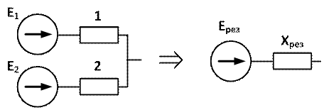 Преобразуем схему, приведенную на рис.6.6. Если генераторы G1 и G2 имеют одинаковые ЭДС, то их можно объединить в эквивалентный генератор с мощностью S = 2Sном.