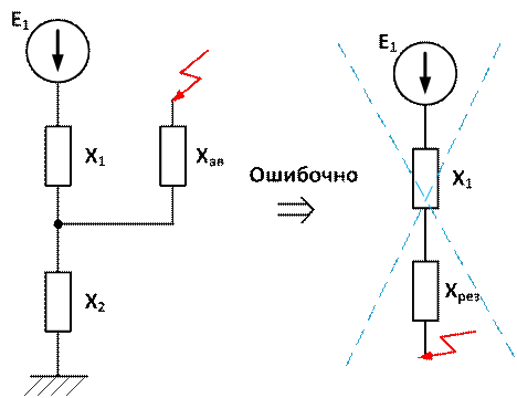 1. Так как задачей расчета тока КЗ является нахождение тока в аварийной ветви, то аварийная ветвь не должна участвовать в преобразовании или участвовать на последних этапах преобразования.