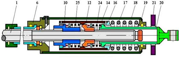 Головка 6 вворачивается в корте 18 и стопорится болтом 8. В головку вставляется защитная труба 4 и крепится в ней запорным кольцом 7 и резиновым кольцом 5. На конце защитной трубы устанавливается муфта 3 с капроновым кольцом 2, предохраняющим авторегулятор от загрязнения. В корпусе авторегулятора расположен тяговый стакан 14, в котором устанавливается вспомогательная 10 и регулирующая 12 гайки с упорными подшипниками 11 и 13, пружинами 24 и 25. В тяговый стакан ввернута крышка и втулка 16, которые стопорятся винтами 9 и 15. Конусная часть стержня 20 входит в тяговый стакан, а на другом конце стержня навернуто ушко 22, которое стопорится заклепкой. Возвратная пружина 17 опирается на коническую поверхность втулки тягового стакана и крышку корпуса 19. Регулировочная 12 и вспомогательная 10 гайки навернуты на регулировочный винт 1, имеющий трехзаходную несамотормозящуюся резьбу с шагом 30 мм. Регулировочный винт заканчивается предохранительной гайкой 23, закрепленной заклепкой, которая предохраняют винт от полного вывинчивания из механизма.