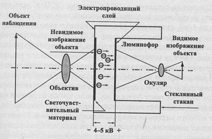Приборы ночного видения.Бинокли позволяют вести наблюдение в светлое время суток. В ночное время могут быть использованы приборы ночного видения, работающие в ближнем инфракрасном диапазоне длин волн (0,8…1 мкм). Структурная схема прибора ночного видения приведена на рис. 3.12 [5].